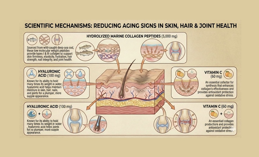 Figure 1: Describes the mechanisms by which hydrolyzed marine collagen peptides, combined with hyaluronic acid and vitamin C, work to support skin elasticity, hydration, hair strength, and joint health.