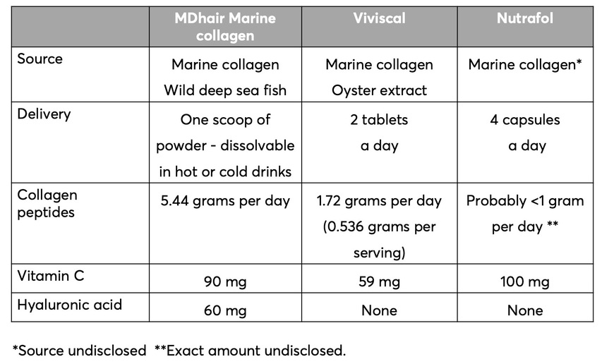 Collagen type I and, to a lesser extent, type III are essential for hair and skin health. Marine Collagen, sourced from wild-caught fish, has more collagen type I than bovine collagen and is better for hair regrowth. Aim to take between 5 - 10 grams of collagen per day. Collagen supplements in capsules usually contain significantly lower amounts of collagen and are less effective.