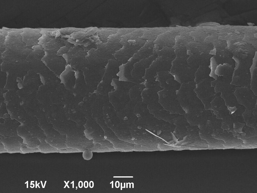 Scanning Electron Microscope (SEM) picture of a damaged hair strand, X 1000 magnification. Open peeling hair cuticles make the hair dull, dry, and fragile. SEM performed for MDalgorithms Inc. at North Dakota State University, Electron Microscopy Core, based on work supported by the National Science Foundation Grant No. 0619098.