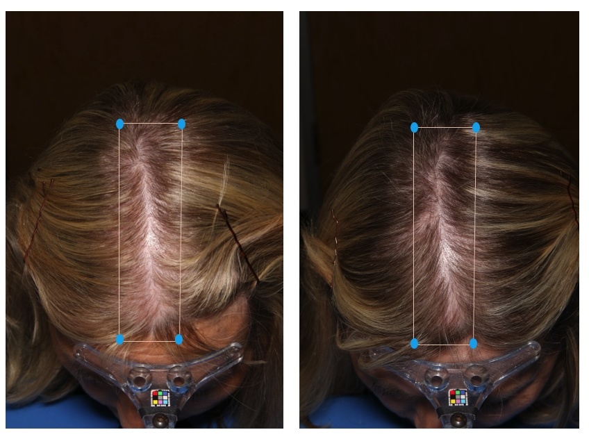 Caucasian woman. Significant improvement in hair density and quality with a visible reduction of hair graying. Before and 24 weeks after treatment with MDhair's Customized treatment kit. MDhair is an IRB-approved clinical study.