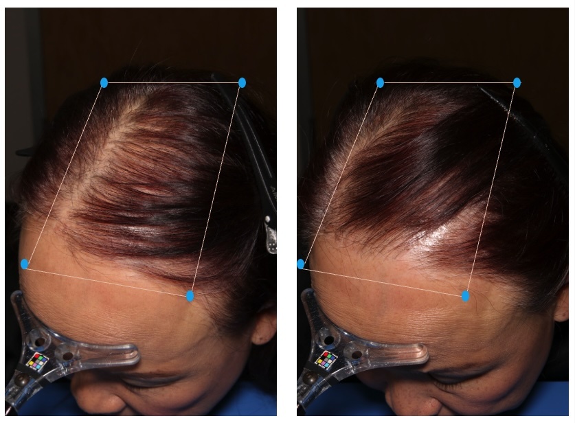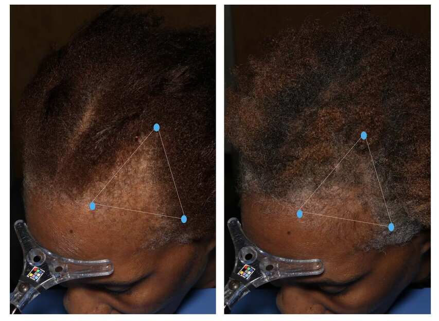 African American woman. Significant improvement in hair density on the temporal areas and hair edges. Before and 24 weeks after treatment with MDhair's Customized treatment kit. MDhair is an IRB-approved clinical study.