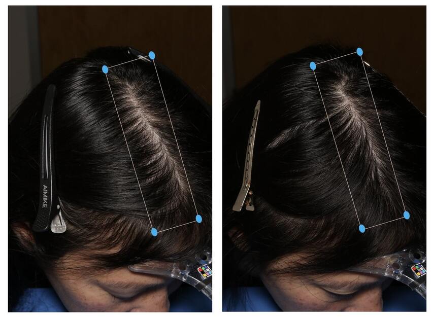 Asian woman. Significant improvement in hair density and quality. Before and 24 weeks after treatment with MDhair's Customized treatment kit. MDhair is an IRB-approved clinical study.