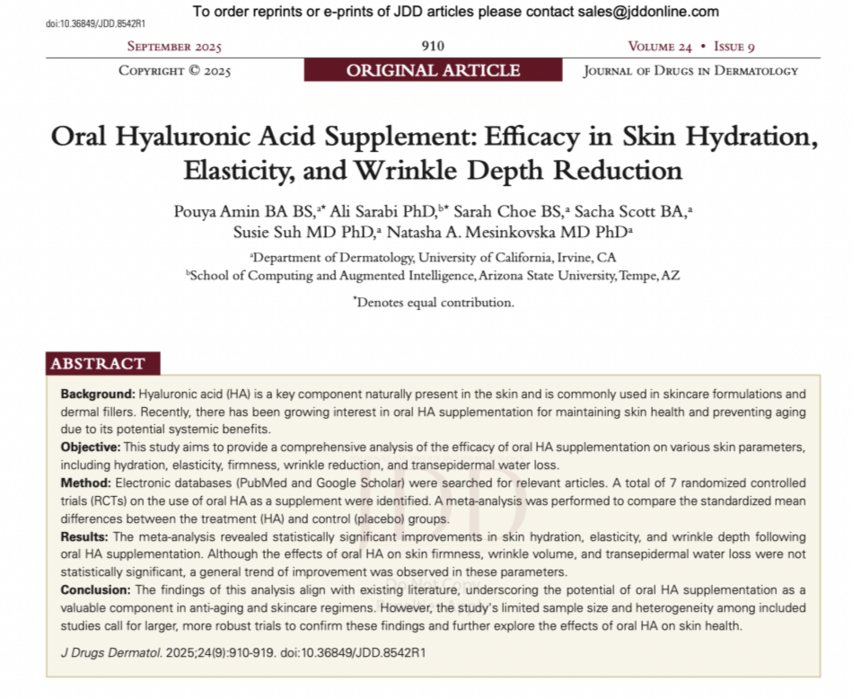 - Amin P, Sarabi A, Choe S, et al. Oral Hyaluronic Acid Supplement: Efficacy in Skin Hydration, Elasticity, and Wrinkle Depth Reduction. J Drugs Dermatol. 2025;24(9):910-919.