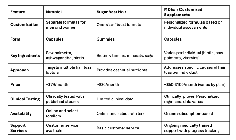 When comparing Nutrafol, Sugar Bear Hair, and MDhair customized supplements, it's clear that each has its unique strengths: